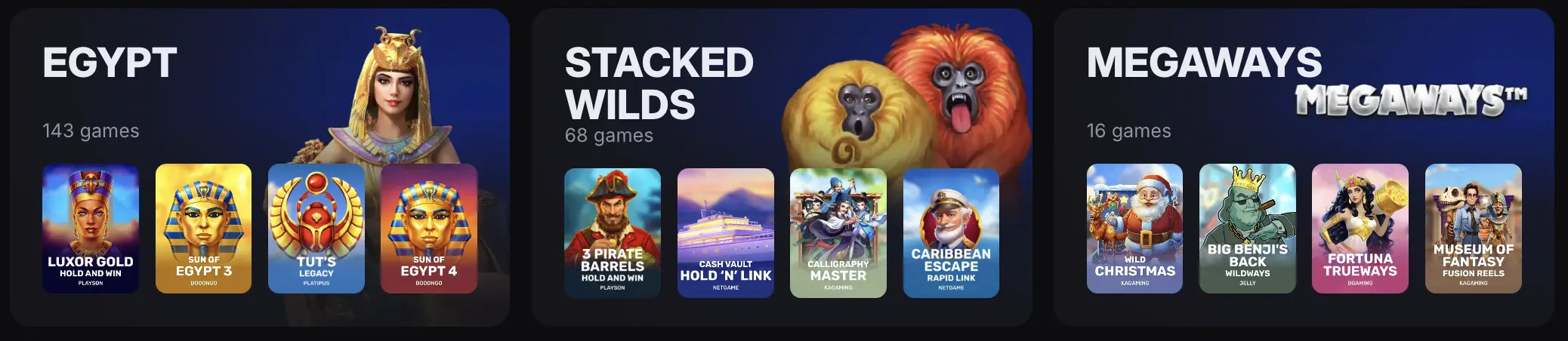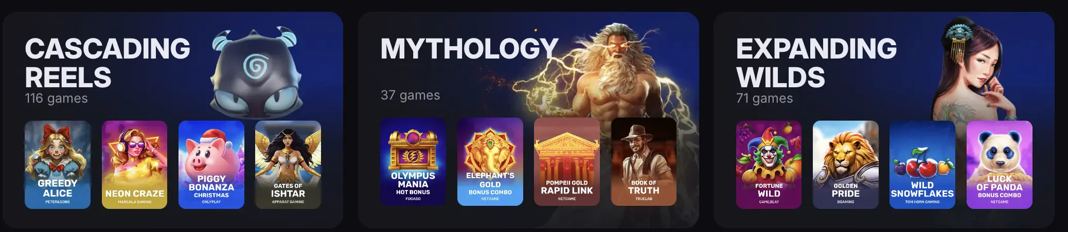 We have listed Sky Crown slots into various categories under the Collections tab based on their mechanics and features. This makes it easier for players to find pokies with specific features, including: